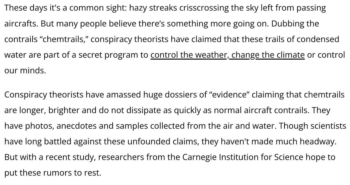 I’m not someone who engages the “chemtrail” subject much at all, though you can imagine how dissidents on various topics wind up being relegated to the same circles at a certain point. Frankly, I’m starting to identify some gaps in logic in the official rebuttal that have caught my attention - and the entire premise is clearly going more mainstream anyway.