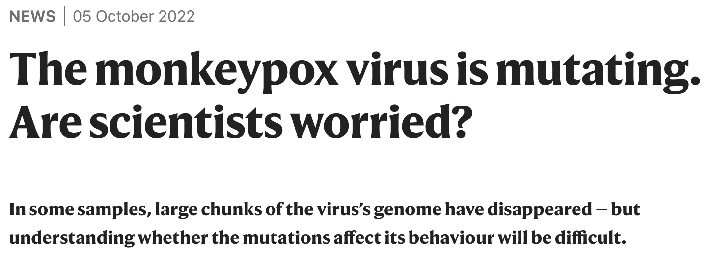 Kozlov, M. (2022). The monkeypox virus is mutating. Are scientists worried? Nature. https://doi.org/10.1038/d41586-022-03171-z
