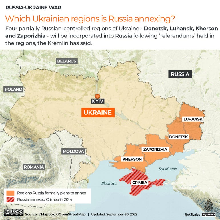 This past week, Russian President Vladimir Putin officially signed into law the recognition of the four formerly contested eastern regions of Ukraine as part of Russia. CBC News doesn’t like this very much - frankly, the world “sham” has appeared across every news story I can find, referring to the referendums held in each region to vote on whether or not to join Russia. Of course, that can be explained by the fact that The Associated Press is authoring the vast majority of these pieces, as the dominant newswire services in North America. Read below for their take:8