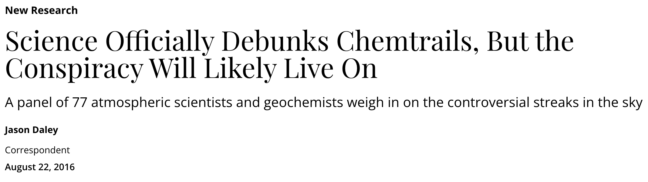 In 2016, the Smithsonian Magazine proudly boasted that “Science” had officially debunked chemtrails.10 Of course, they made sure to equate people asking about weird streaks in the sky to people who think lizards rule the world. Stay classy, Smithsonian.